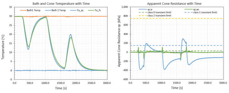 Temperature influence verification is comprehensively handled in the standard, with the cone subjected to a series of sudden changes of ambient temperature set at 0 and 30 degrees, which is a magnitude consistent with highly unfavourable testing conditions. The certificate extract below shows the temperature of the cone load cell during the heating and cooling process in the left had graph, and the resulting apparent cone resistance before correction (qc;a) and after correction (qc;ac) in the right hand graph. This information is highly valuable when assessing the likely error (or residual error after correction) associated with the reported temperature change during a test.