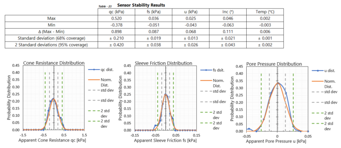 Although not required by the standard, a sensor stability verification has been included in the certificate to serve as a baseline comparator for the field stability verification values obtained before and after each CPT (required by ISO standard), which may be influenced by additional electrical noise (particularly with the cone above ground) and mechanical vibration, amongst other things.