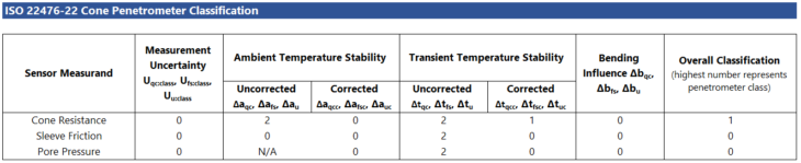 To alleviate the burden of understanding each aspect of the calibration and verification results, the calibrated cone is assigned penetrometer ‘class’ number from 0 (best) to 4 (worst). Lankelma present the classification for each parameter considered in the assessment, and then an overall classification for each sensor, as shown here: